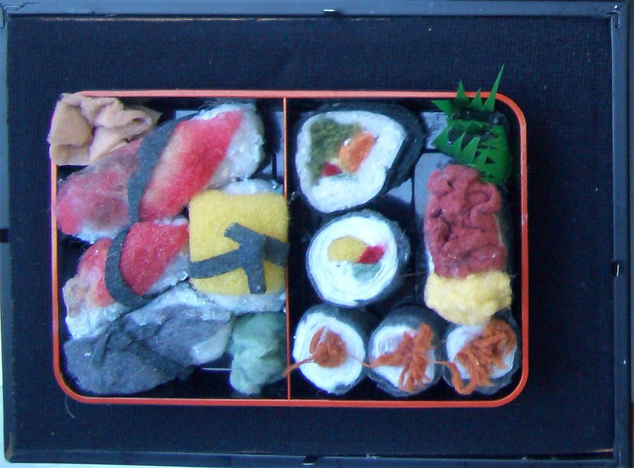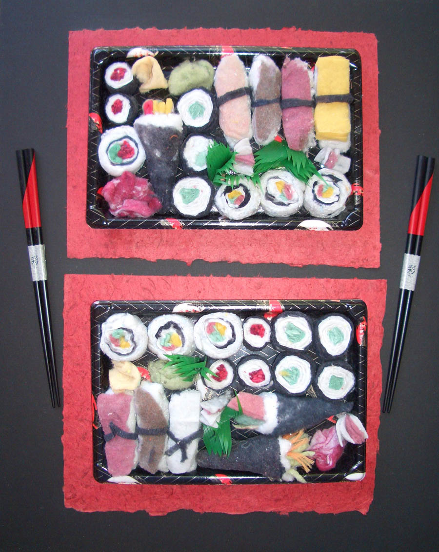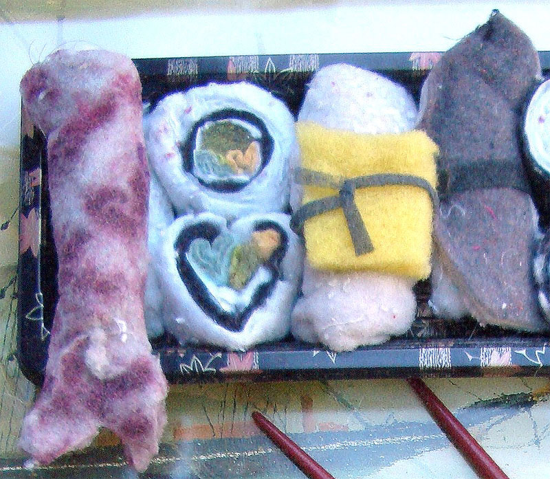 above: Dryer lint sculpted to emulate sushi in a plastic tray by Slater Barron